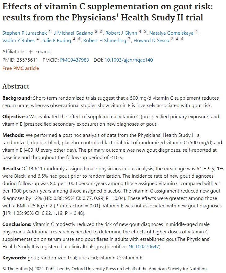 Effects of vitamin C supplementation on gout risk: results from the Physicians’ Health Study II trial. Am J Clin Nutr. 2022 Sep 2;116(3):812-819.