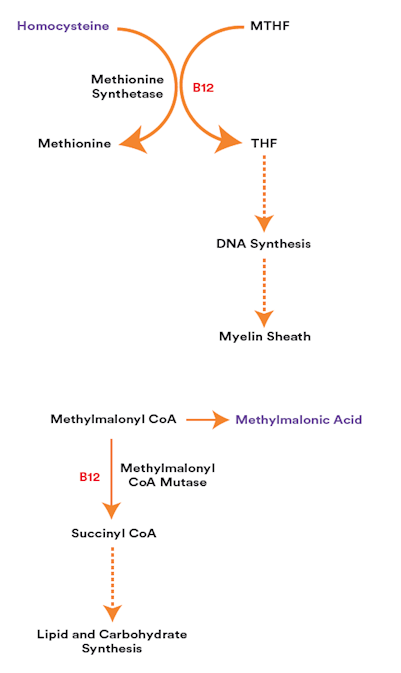 Serum cobalamin levels are generally a sensitive marker of B12 deficiency. In fact, 95% of patients with low B12 levels show elevated serum methylmalonic acid (MMA) or total homocysteine levels (2). But why does this happen?