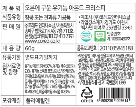 ✔️아몬드 함량60%, 글루텐프리에 한봉지에 단백질이 11g 들어있네요!