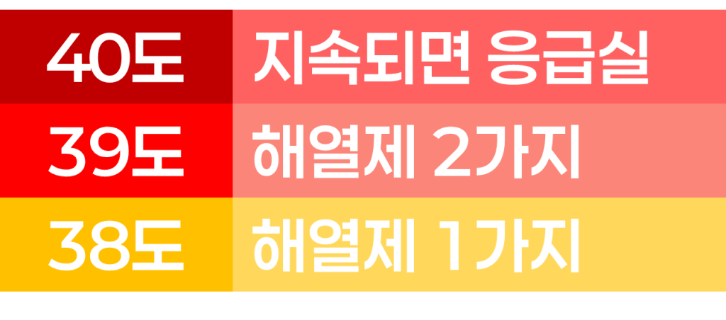 ✔️40도 이상: 해열제 복용후 2시간 이상 열이 떨어지지 않으면 응급실로 가세요.